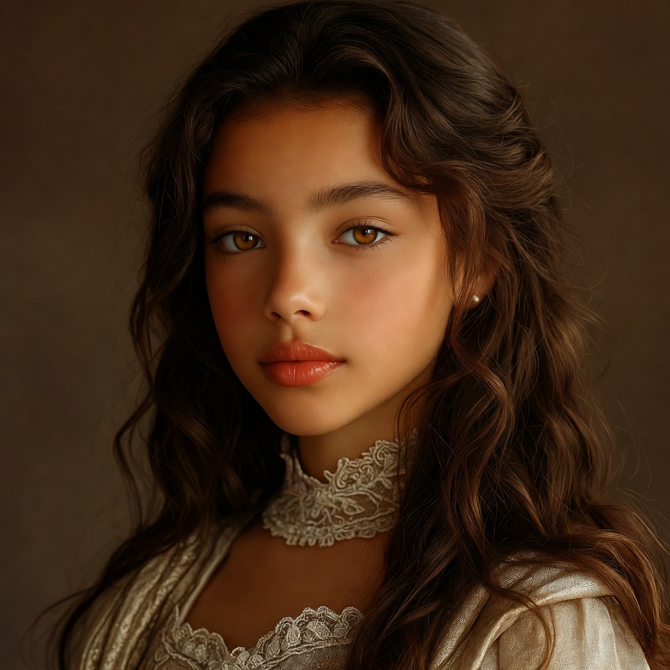background, beauty, brown shades, calm, close-up, culture, details, expression, girl, lace, lace collar, light, long hair, natural light, portrait, smiling, soft focus, texture, warm tones, youth