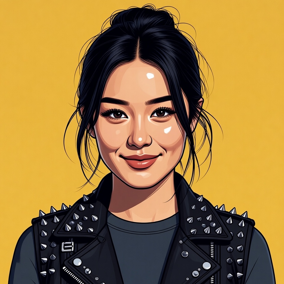 accessories, art, beauty, bold colors, bright background, casual wear, character design, confident smile, creative design, expression, fashion, hairstyle, illustration, leather jacket, modern style, personality, portrait, spikes, young woman, youth culture