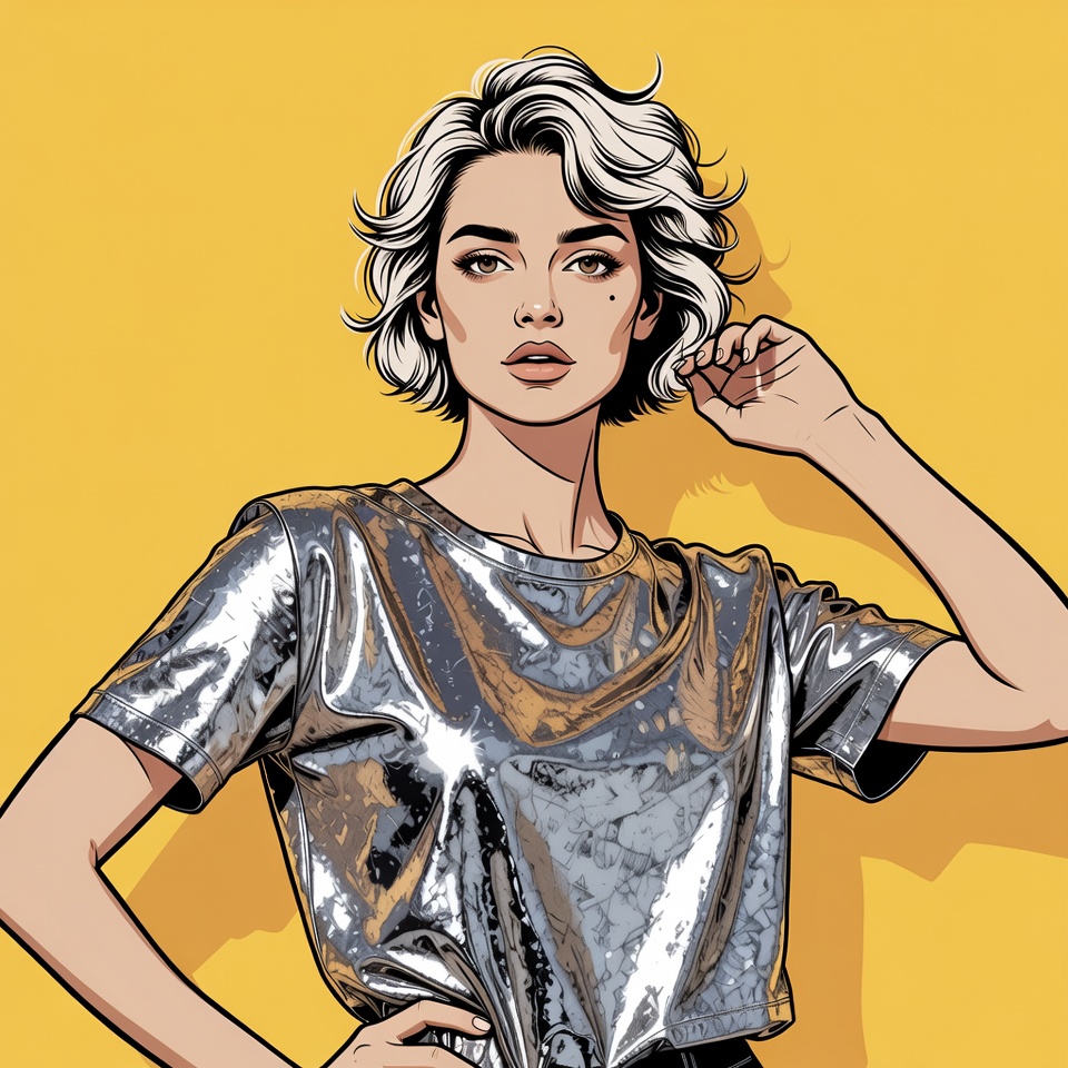 A woman with short hair poses confidently wearing a shiny silver shirt against a bright yellow background. She has a direct gaze.