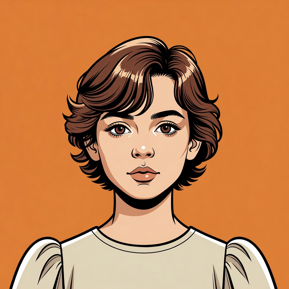 art, casual, character, creative, design, everyday, expression, fashion, girl, hairstyle, illustration, neutral expression, orange background, portrait, short hair, simple clothing, smiling, studio, young adult, youth