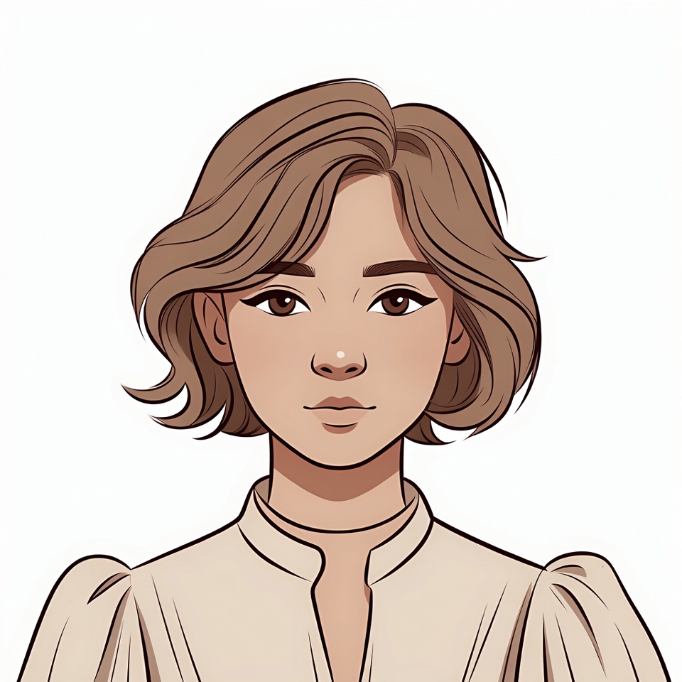 art style, brown hair, casual look, character design, close-up, direct gaze, everyday wear, female, hairstyle, headshot, illustration, light top, medium hair, modern fashion, neutral expression, plain background, portrait, simple outfit, young woman, youth