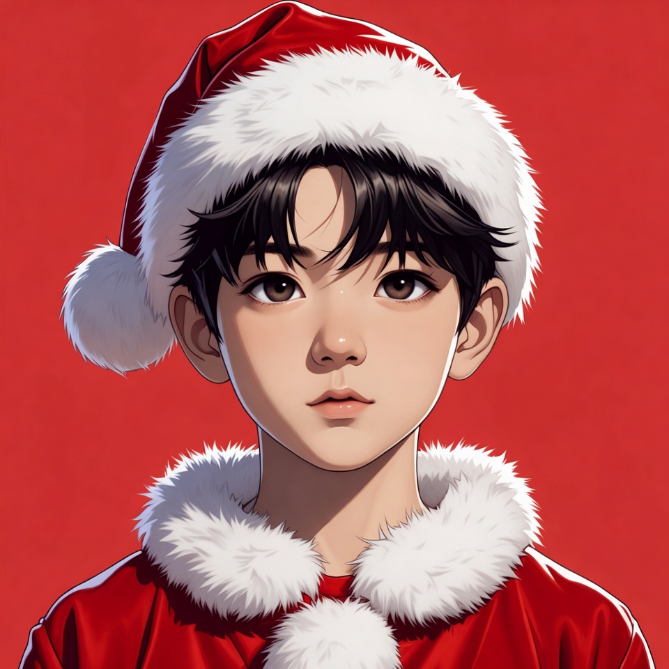A young person wearing a Santa hat looks directly at the viewer. The background features a solid red color, emphasizing the holiday theme.