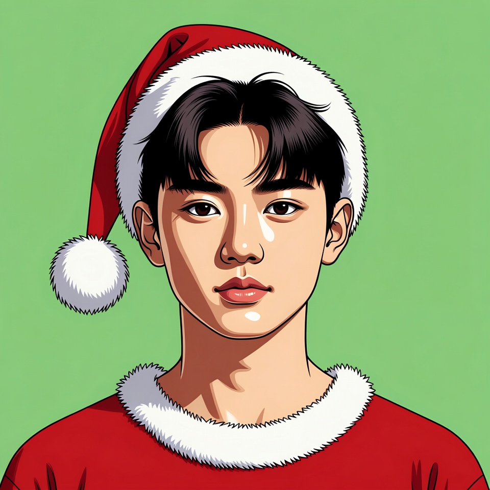Christmas, Santa hat, accessories, boy, cartoon, celebration, character, cheerful, festive, green background, holiday, portrait, red shirt, season, smiling, tradition, white trim, winter, young, youth