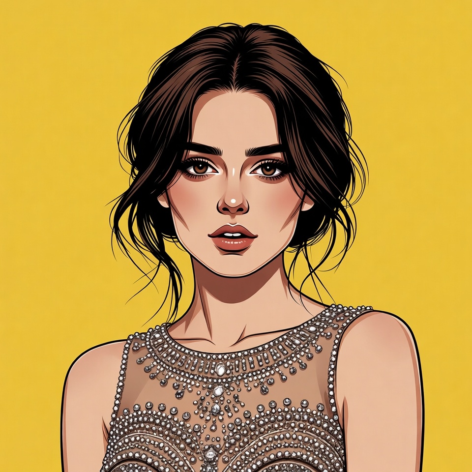 A woman stands against a bright yellow background. Her hair is dark and wavy, and she wears a sparkly dress with beads.