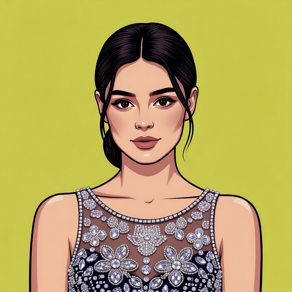 Woman poses in a glittering dress with a simple hairstyle. She stands against a bright green background, focused and confident.