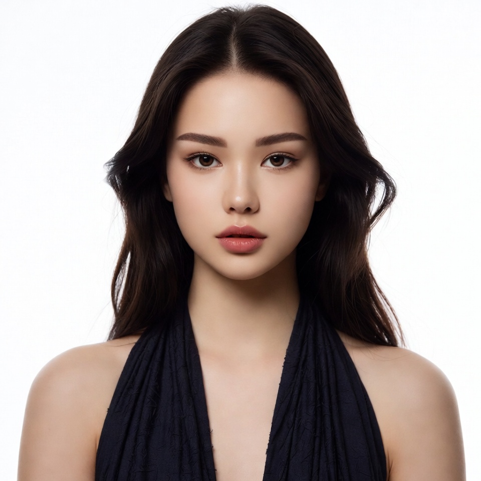 A woman with long dark hair stands in a neutral pose against a light background, showcasing her features and elegance.