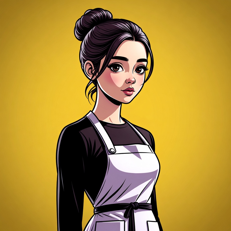 apron, art, background, bun, casual, character, color, cooking, expression, female, food, hairstyle, kitchen, portrait, preparation, standing, woman, work, yellow, young