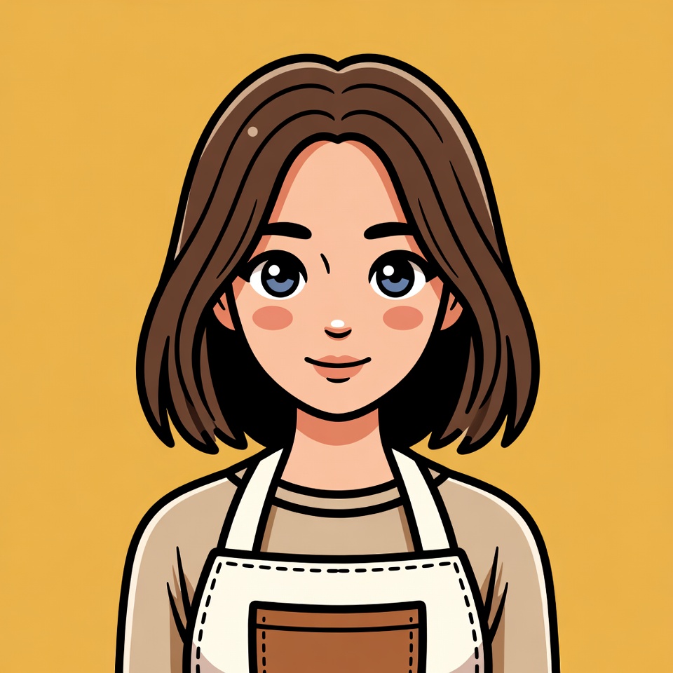 apron, art, at home, brown hair, cartoon style, casual dress, character, cheerful, drawing, female, friendly expression, graphic art, illustration, kitchen, portrait, simple lines, smiling, woman, yellow background, young adult