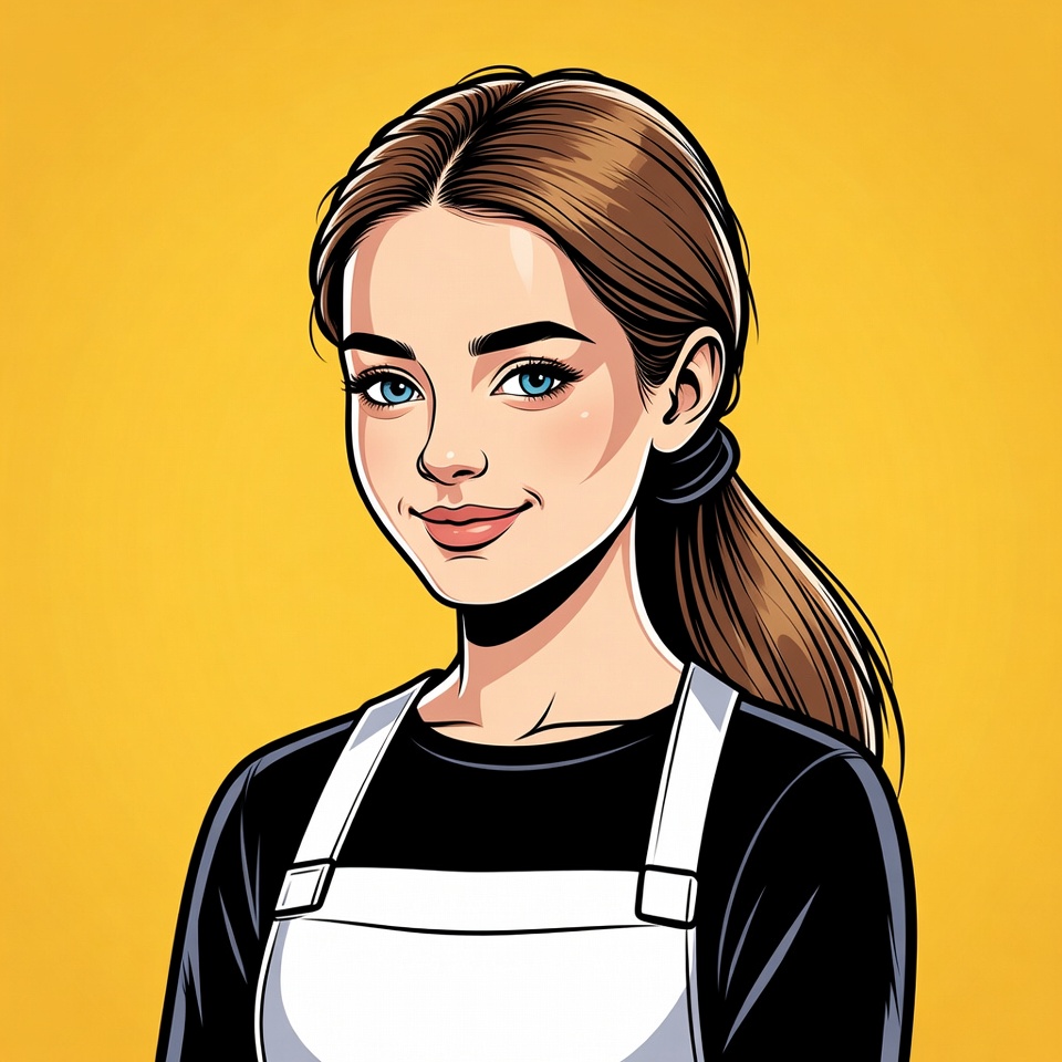 A young woman with long hair stands wearing an apron. She smiles against a yellow background. Her expression conveys friendliness and warmth.