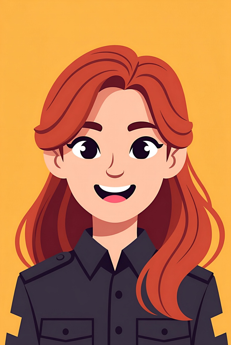 Cartoon character smiles while wearing a uniform. The character has long orange hair and a simple background.