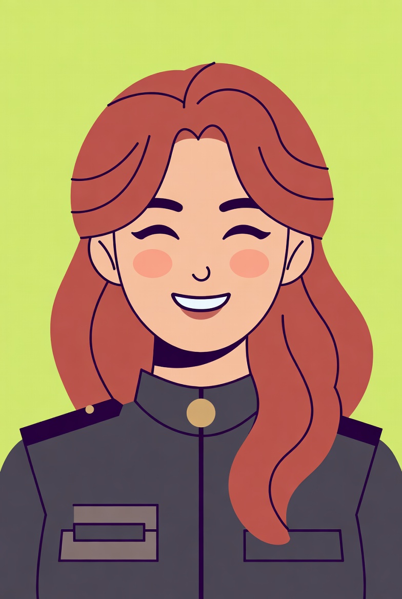 A woman with red hair smiles while wearing a uniform. She has a cheerful expression and stands against a bright green background.
