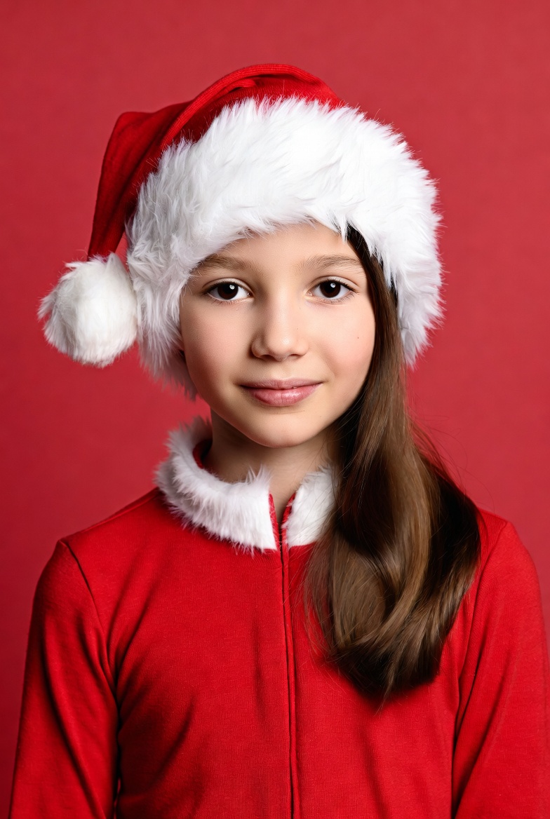 A child poses in front of a red background wearing a Santa hat and red outfit for a festive celebration.