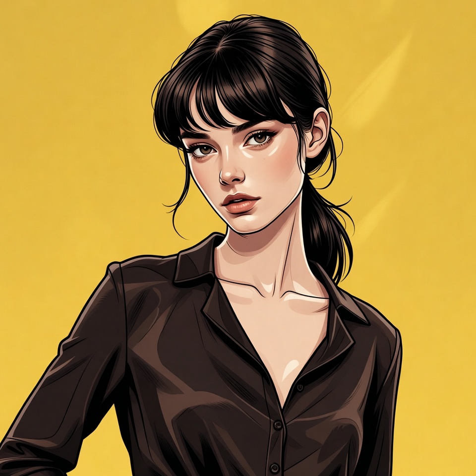 A woman poses with a focused expression. She wears a black shirt and has long hair. The bright yellow background highlights her features.