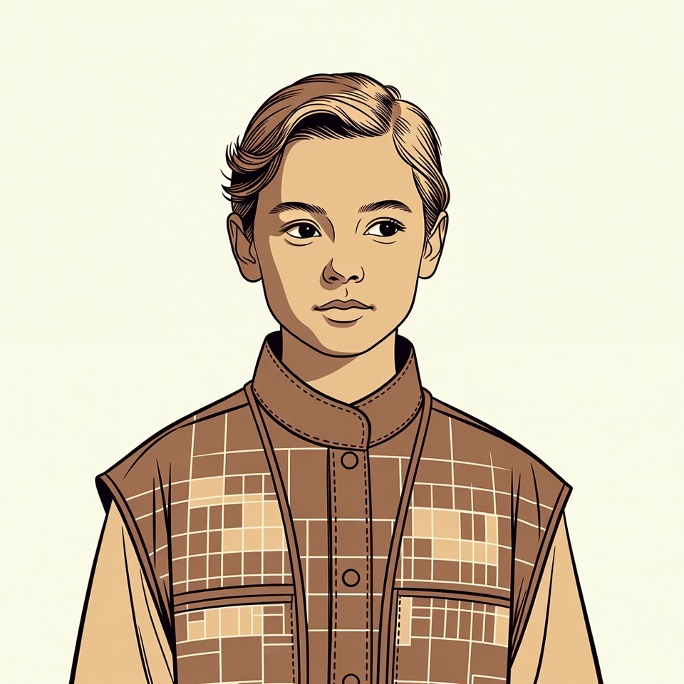 A boy stands and looks straight ahead while wearing a plaid vest over a light shirt. His hair is neatly styled.