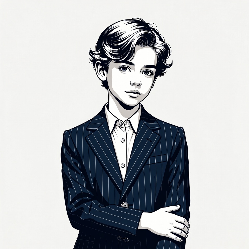 A boy stands confidently with arms crossed, wearing a suit and a shirt. His hairstyle complements his formal look.