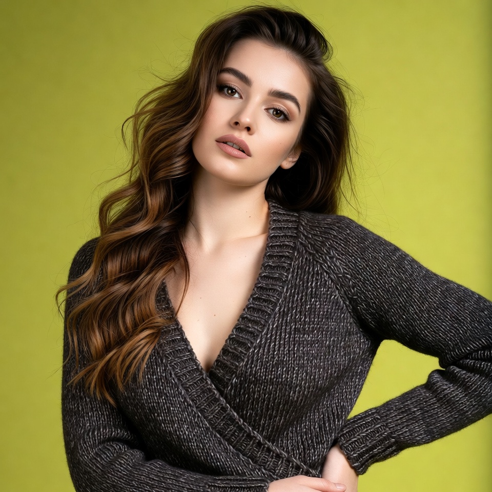 A model stands in a studio with a green background, wearing a dark sweater and showcasing her long hair while striking a confident pose.