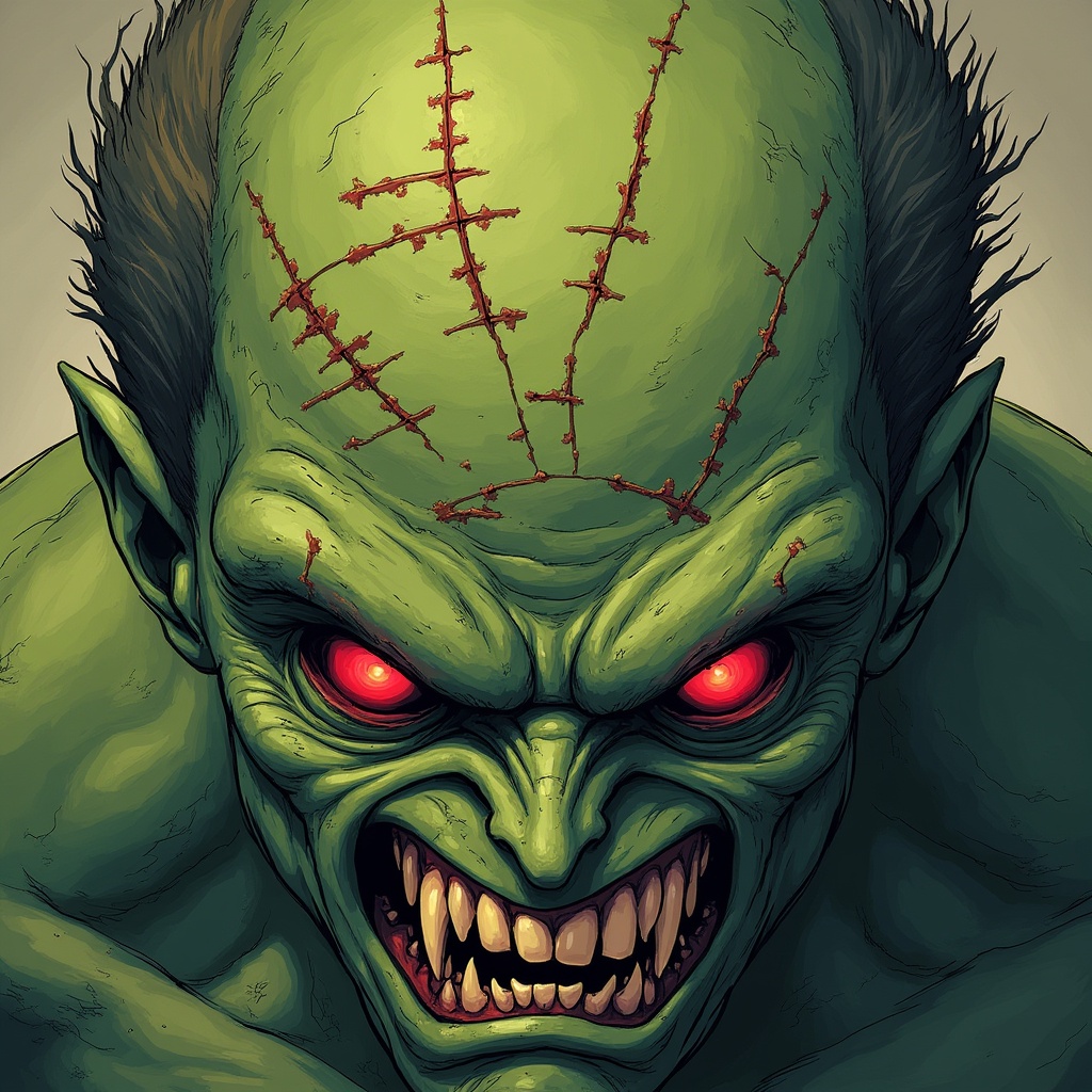 angry, art, character, creature, darkness, design, evil, expression, fantasy, fierce, graphic, green, horror, illustration, imagination, monster, red eyes, scars, supernatural, teeth