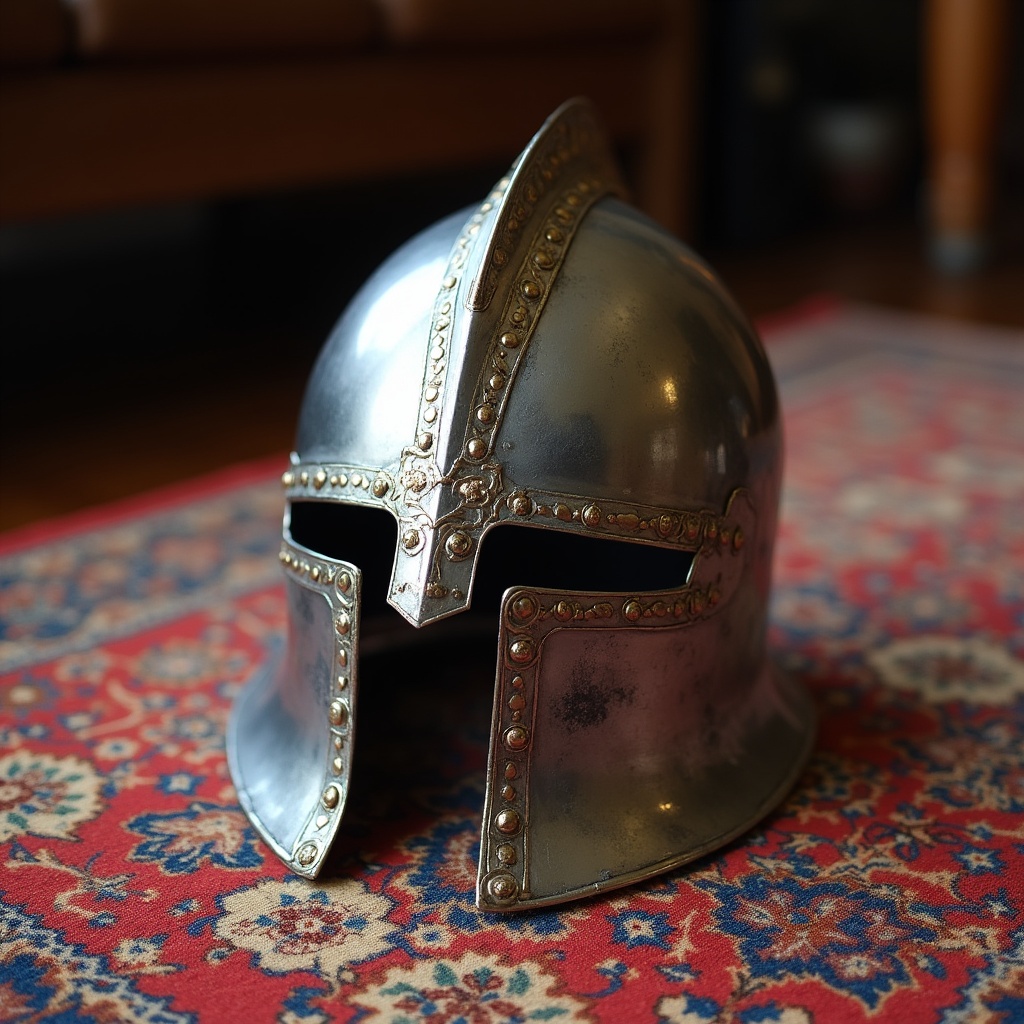 A metal knight helmet rests on a colorful carpet inside a room with wooden furniture. The helmet has shiny details and a historical look.