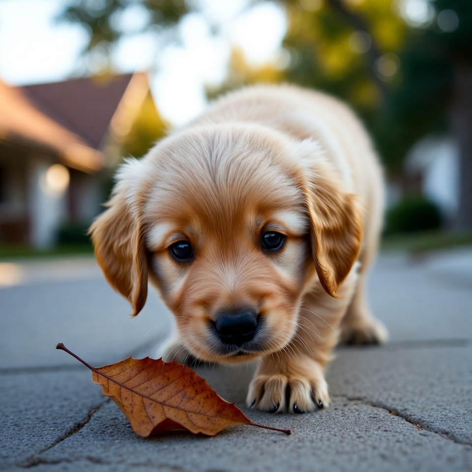 animal, cute, dog, excitement, exploration, furry, golden retriever, ground, home, joy, leaf, nature, outdoors, pet, play, playful, puppy, sniffing, sunlight, young