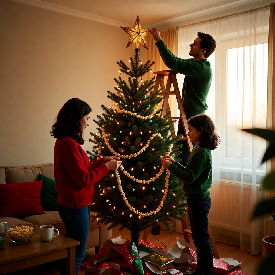 Christmas, celebration, childhood, decoration, family, festive, gathering, gifts, green, holiday, home, joy, ladder, lights, living room, ornaments, together, tradition, tree, winter