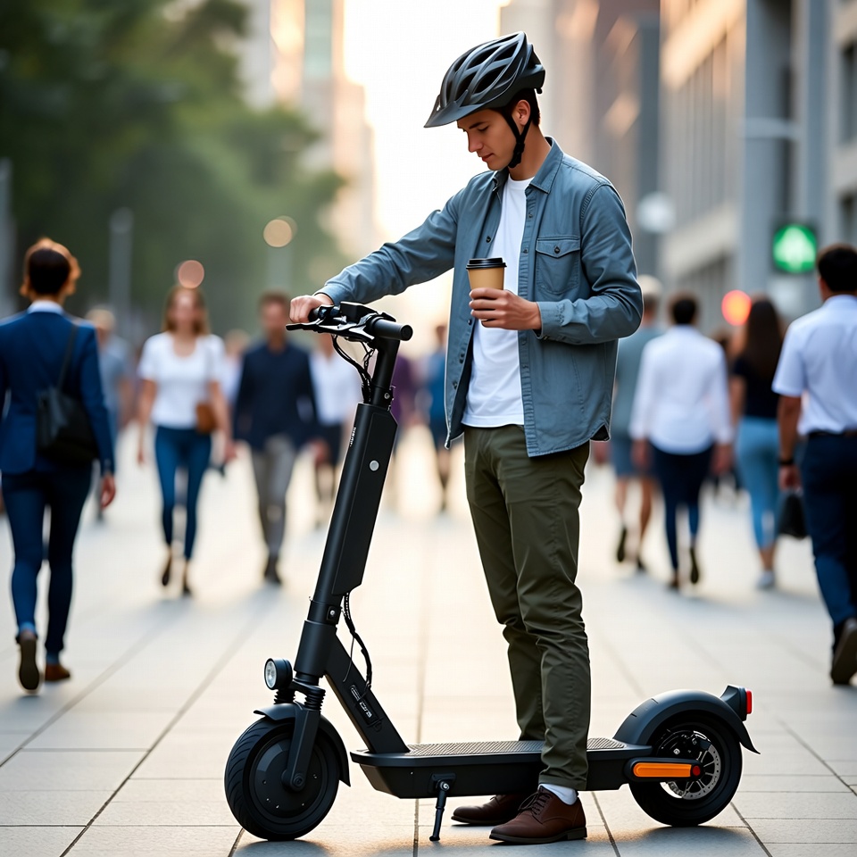A man stands on an electric scooter in a busy city street. He holds a coffee while people walk around him in the background.