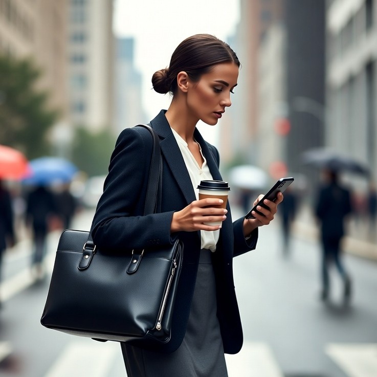 A woman stands on a busy street, holding coffee and checking her phone while dressed in a business suit. Rainy day in the city.