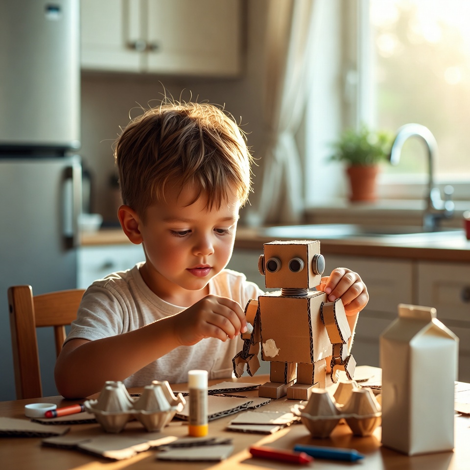 A child works on assembling a cardboard robot at a table. The warm light from the window creates a cozy atmosphere in the kitchen.