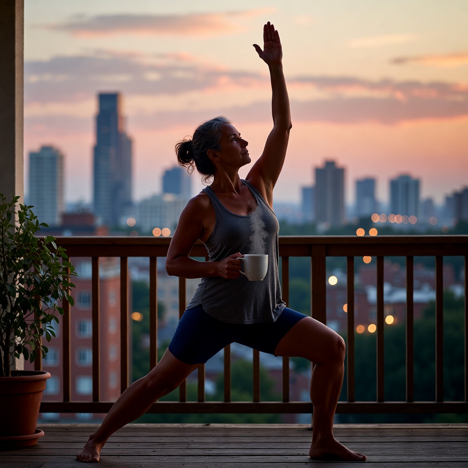 A person practices yoga on a balcony during sunset with a city skyline in the background while holding a cup.