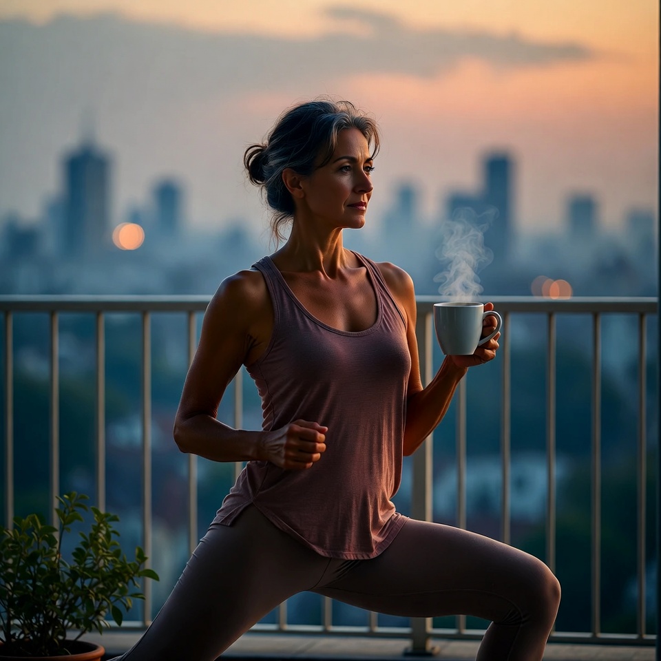 balcony, beverage, city skyline, coffee, exercise, fitness, health, lifestyle, morning, nature, outdoor, pose, reflection, scenic, steam, sunrise, tranquility, urban, woman, yoga