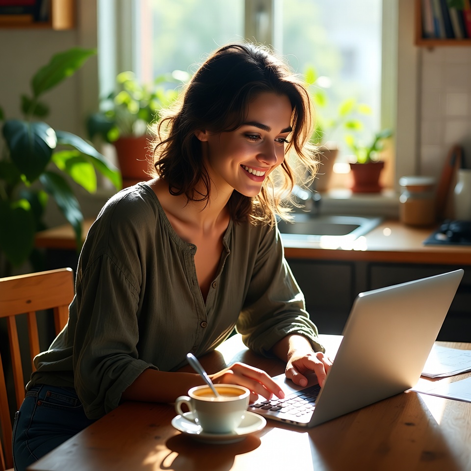 A woman sits at a wooden table using a laptop. Sunlight fills the kitchen, and a cup of coffee sits beside her.