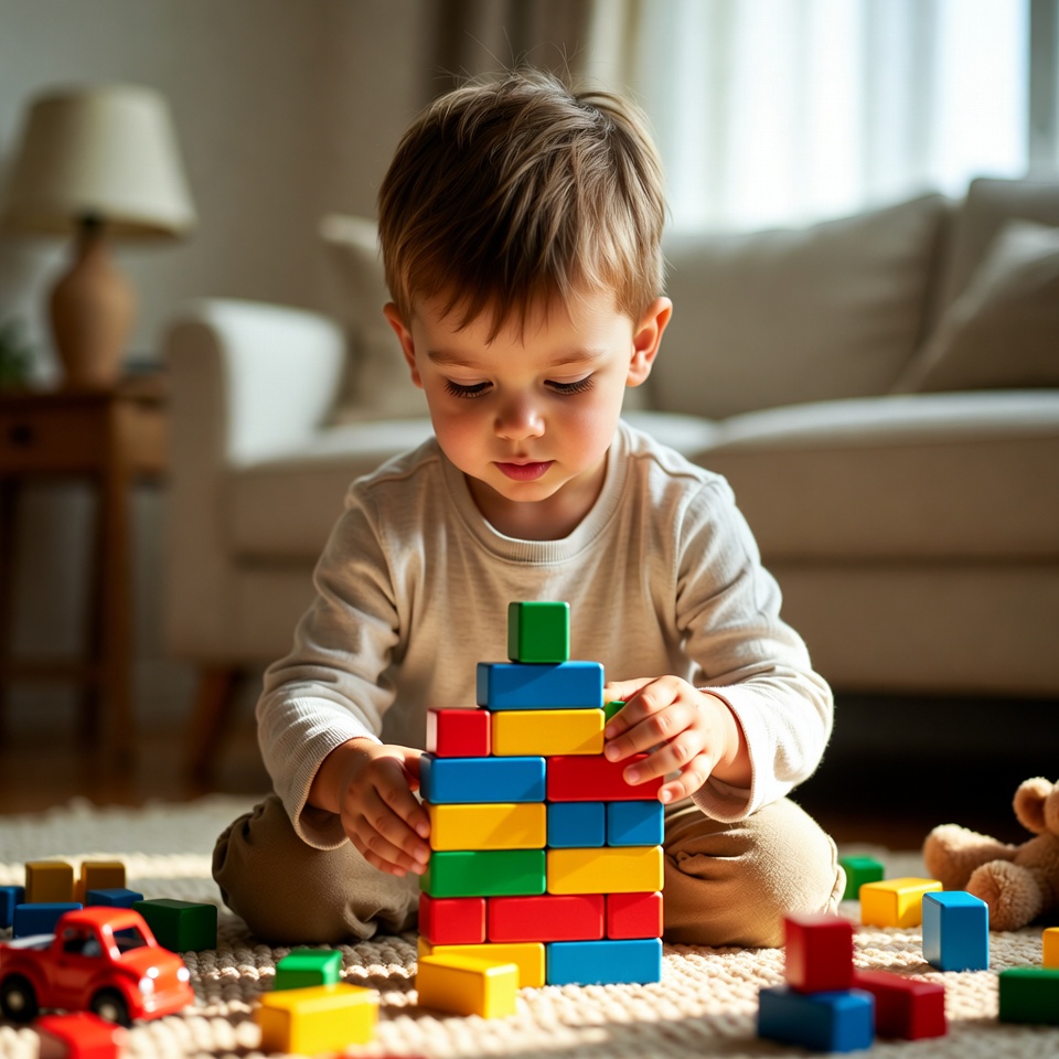 A child is stacking colorful blocks on a mat while sitting on the floor. Toys are scattered around in a living room.