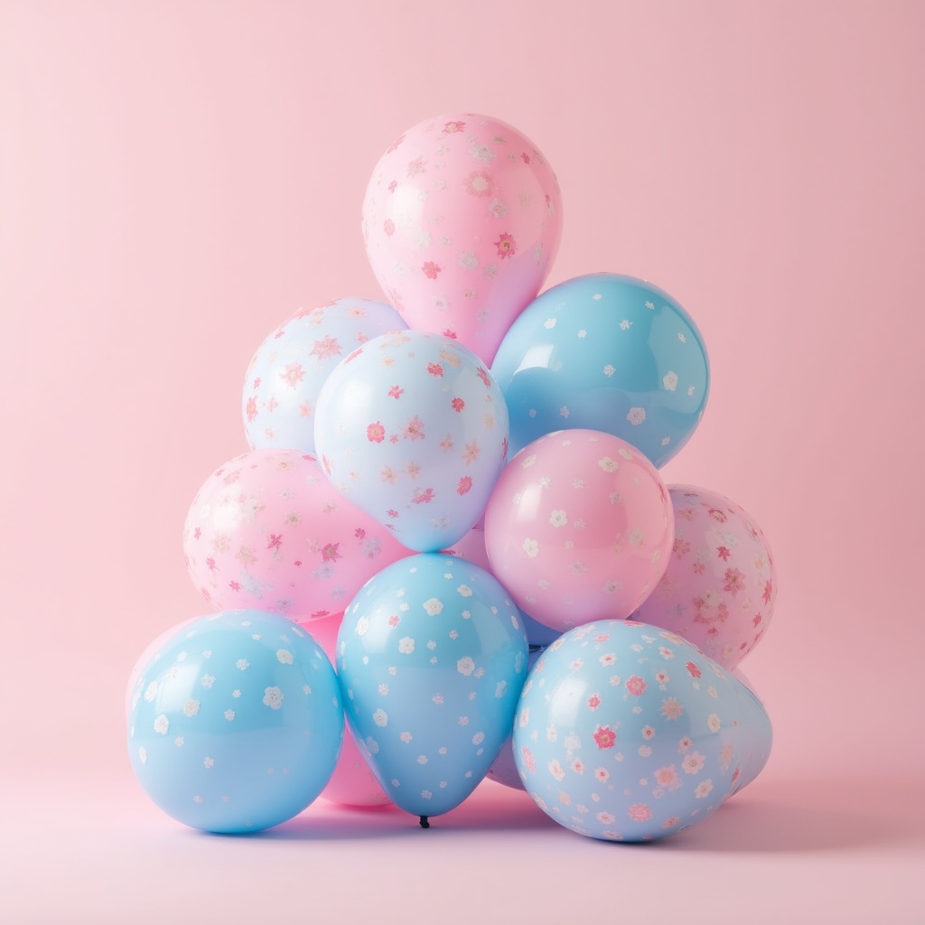 Balloons in light blue and pink colors are stacked together on a light pink surface.