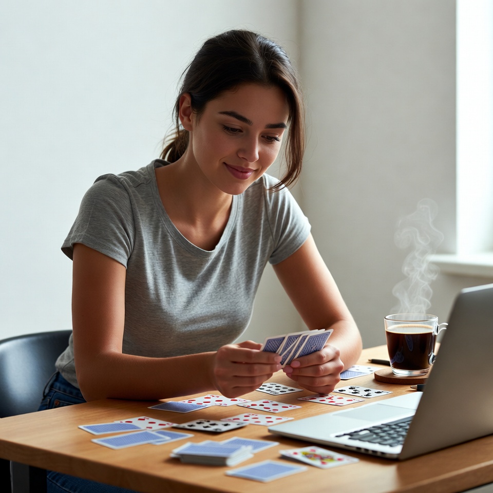 A woman sits at a wooden desk with a laptop. She looks at playing cards while a cup of coffee steams nearby.