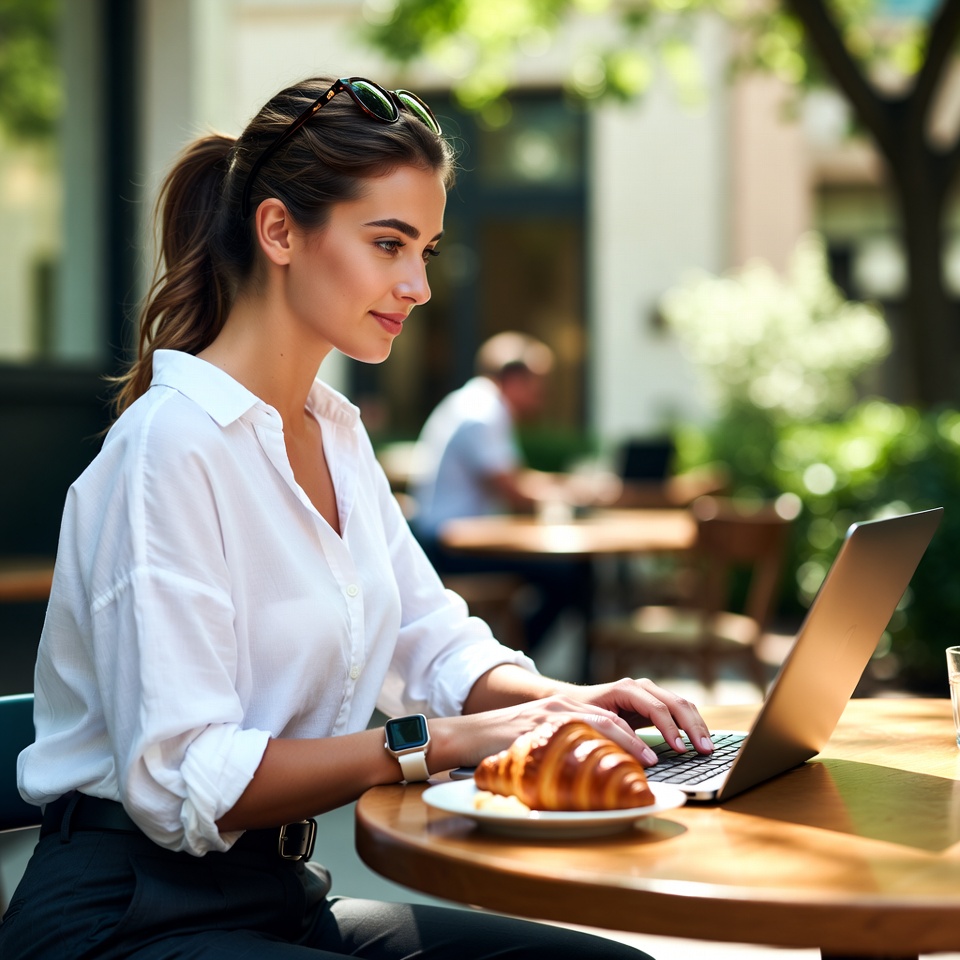 breakfast, business, cafe, casual, city, croissant, daytime, drink, eating, laptop, lifestyle, outdoor, relaxing, sunglasses, table, technology, trees, typing, woman, working