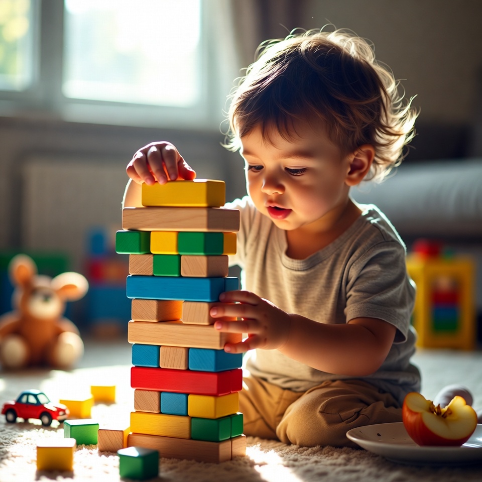 activity, apple, attention, blocks, building, child, creativity, cute, exploration, focused, fun, games, indoor, learning, plate, playful, playtime, soft carpet, tower, toys
