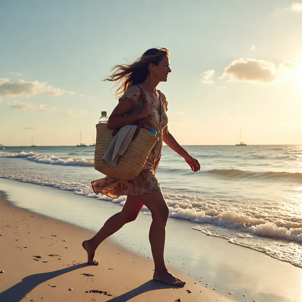A person walks barefoot on the beach while carrying a basket and towel. The sun sets on the horizon, creating a warm glow in the sky.