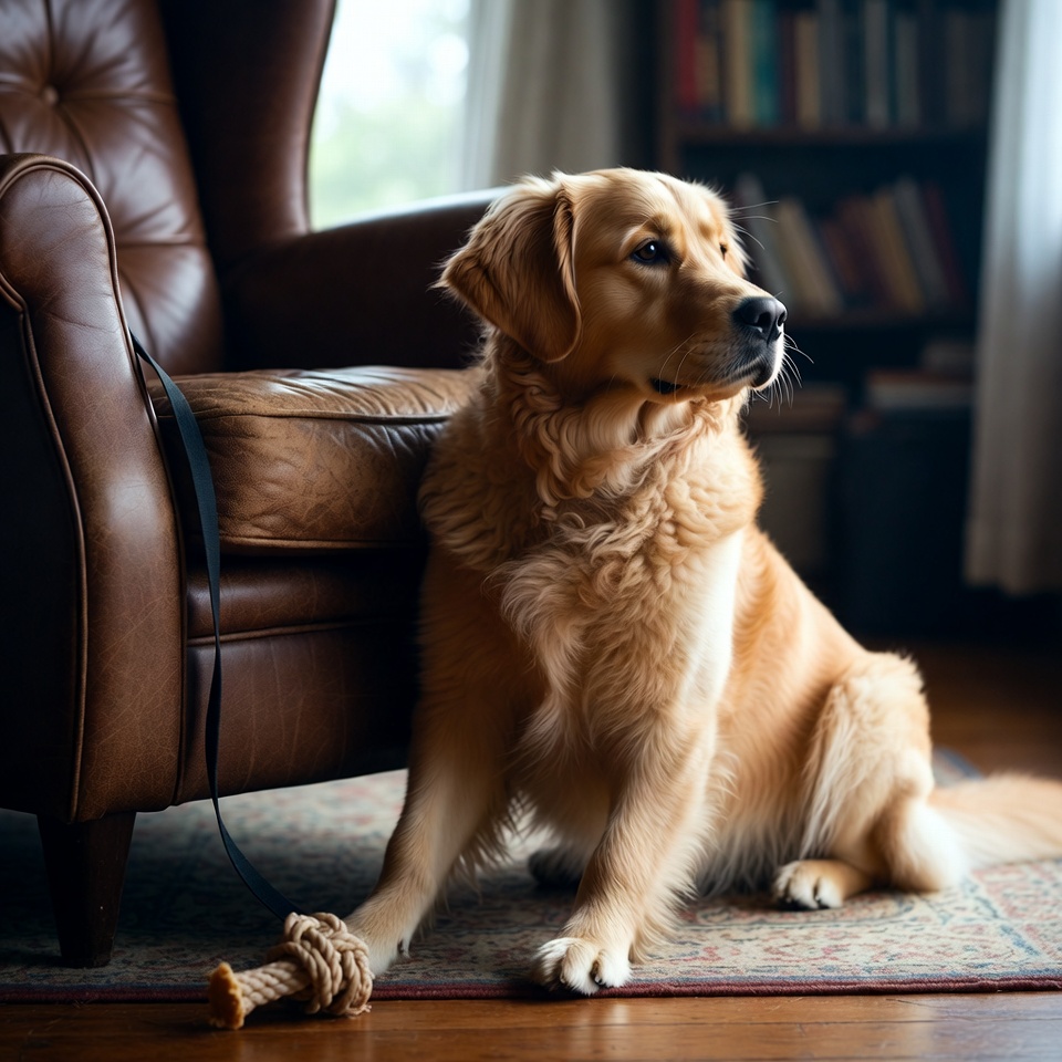 animal, attention, chair, companion, cozy, dog, domestic, family, furniture, golden retriever, hardwood floor, home, indoor, leash, living room, pet, playful, relaxation, toy, waiting