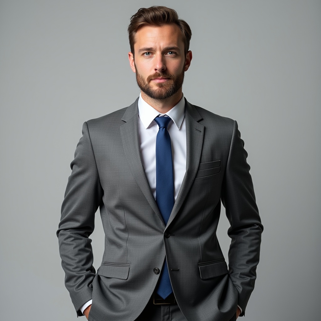 A man wearing a gray suit with a tie stands confidently against a plain background, showing a formal pose with hands in pockets.