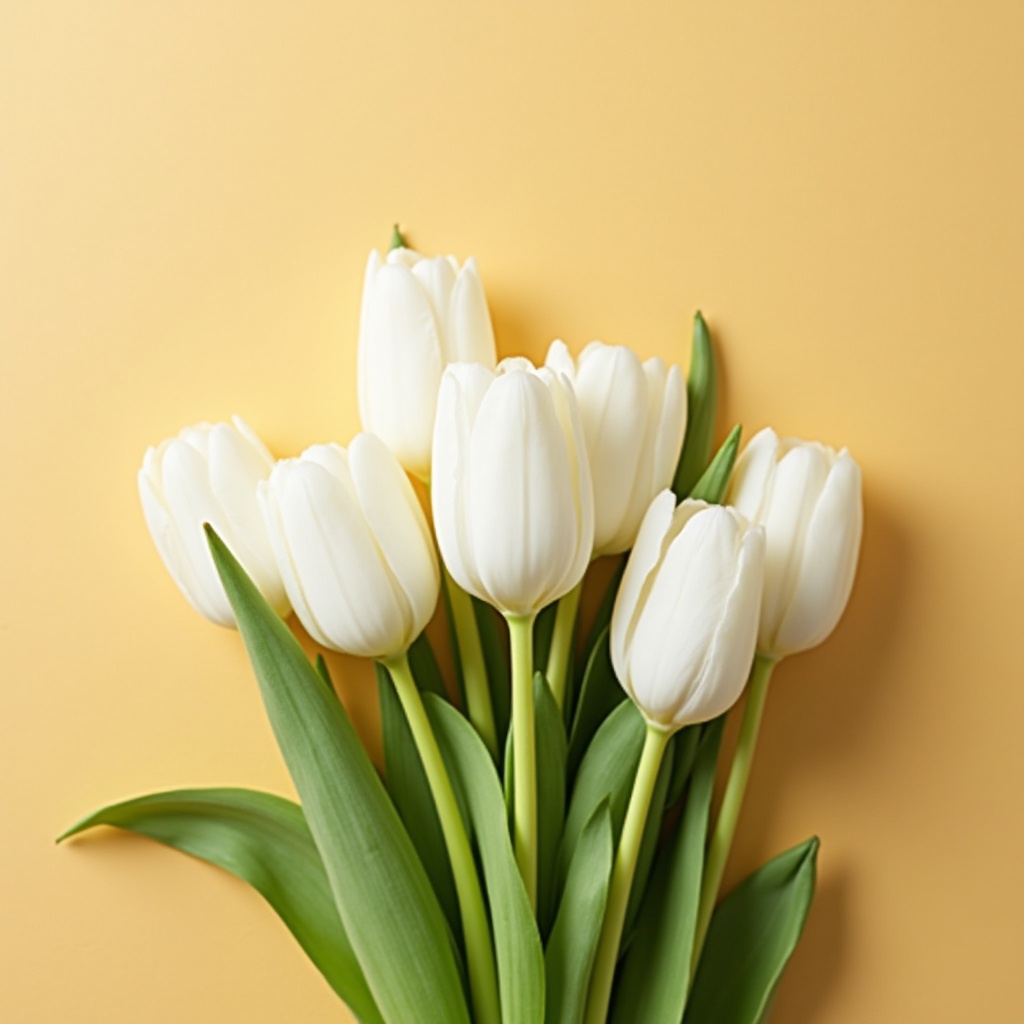 White tulips are gathered together with green leaves against a yellow background. The flowers display their smooth petals and fresh look.