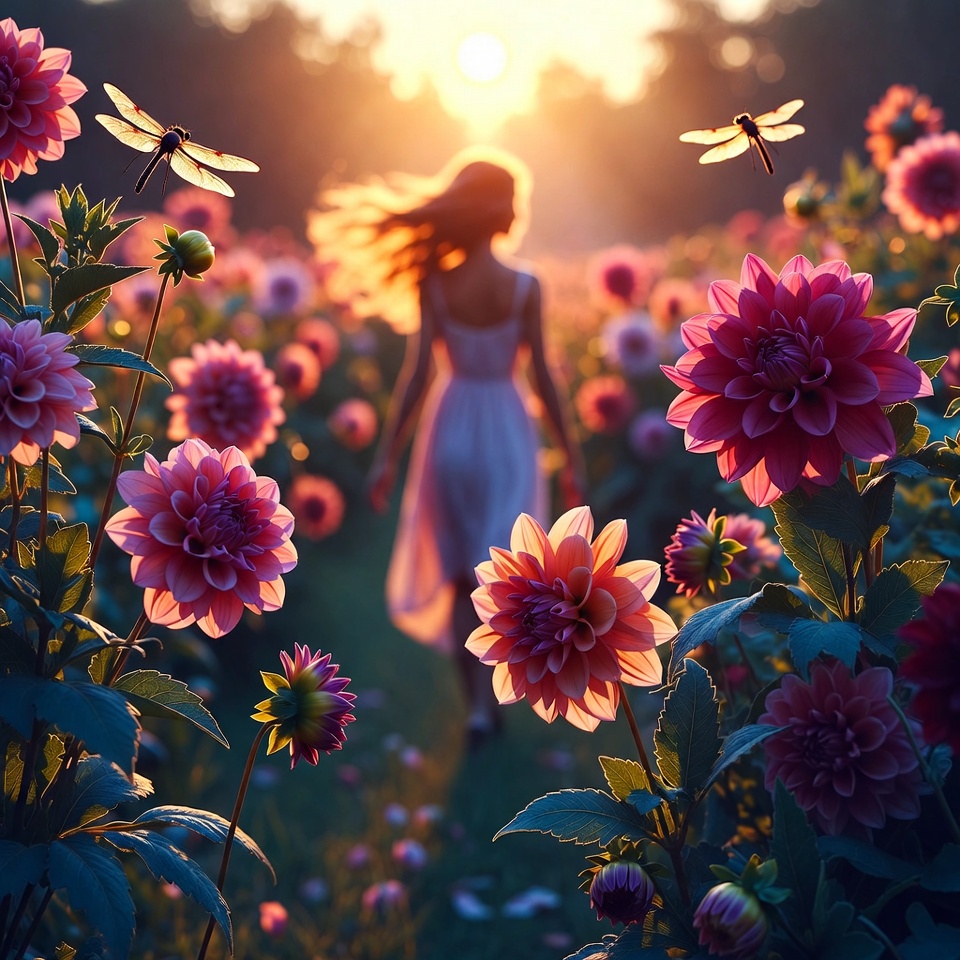 beauty, blooms, dahlias, enjoyment, floral, flower field, garden, insects, landscape, nature, outdoor, petals, relaxing, scene, silhouette, summer, sunlight, sunset, walking, woman