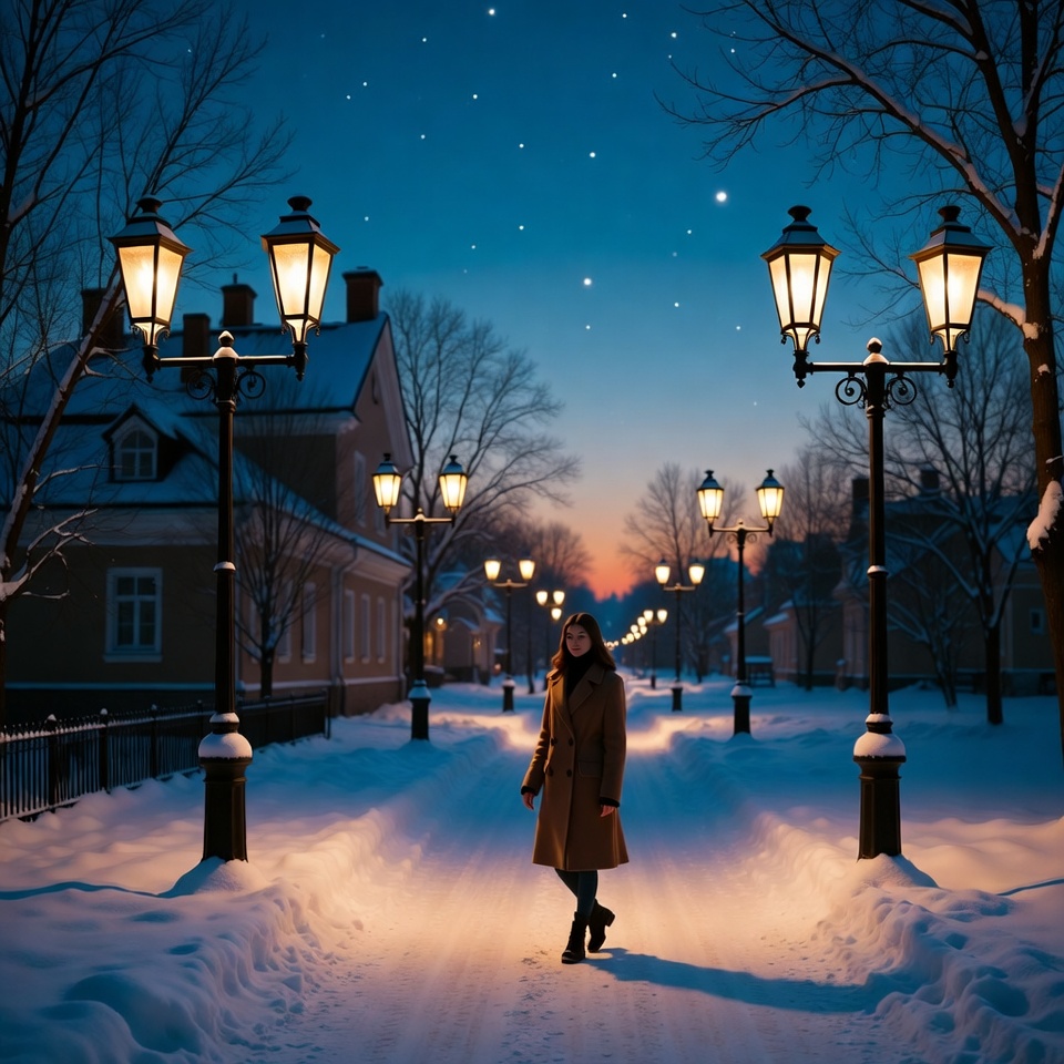 boots, chill, city, coat, dusk, evening, landscape, lights, outdoor, path, quiet, scene, snow, stars, street lamps, town, trees, walk, winter, woman