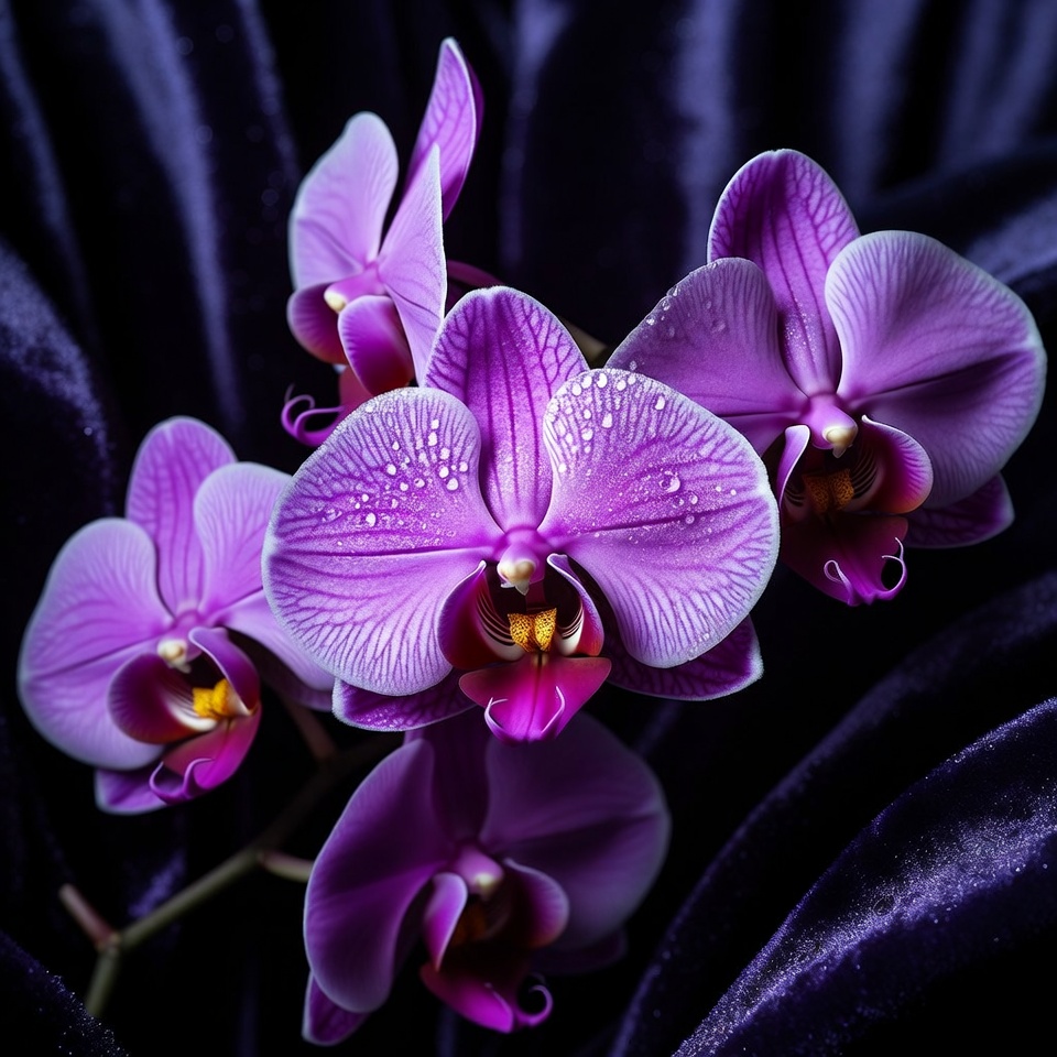 Orchids with purple blooms are arranged on dark fabric. Water droplets rest on the flower petals. The scene has a simple setup and soft light.