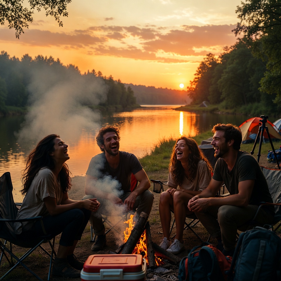 Four friends sit by a campfire near a river during sunset. They laugh and share stories while enjoying the outdoors together.