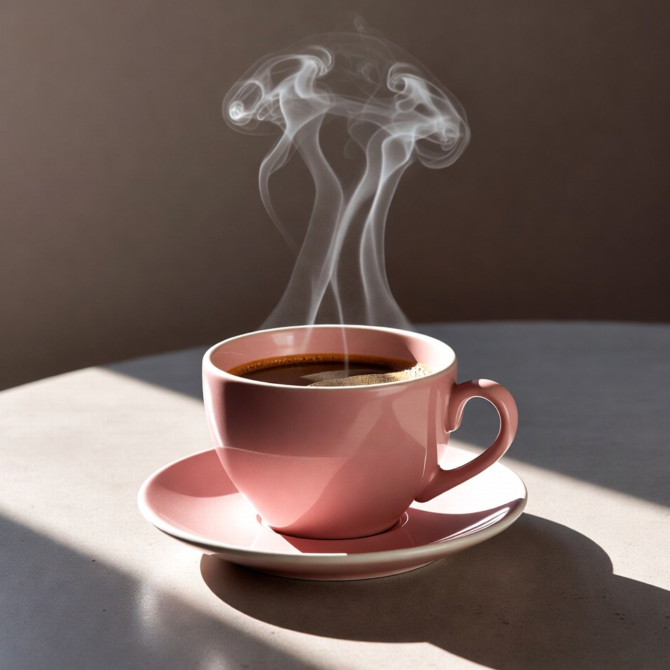 A warm cup of coffee sits on a table. Steam rises from the drink in the sunlight, creating a cozy atmosphere.