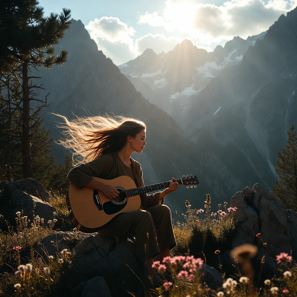 flowers, guitar, hair, landscape, leisure, mountains, music, nature, outdoors, peaks, playing, relaxation, rocks, scenery, scenic, sky, sunlight, sunset, trees, woman