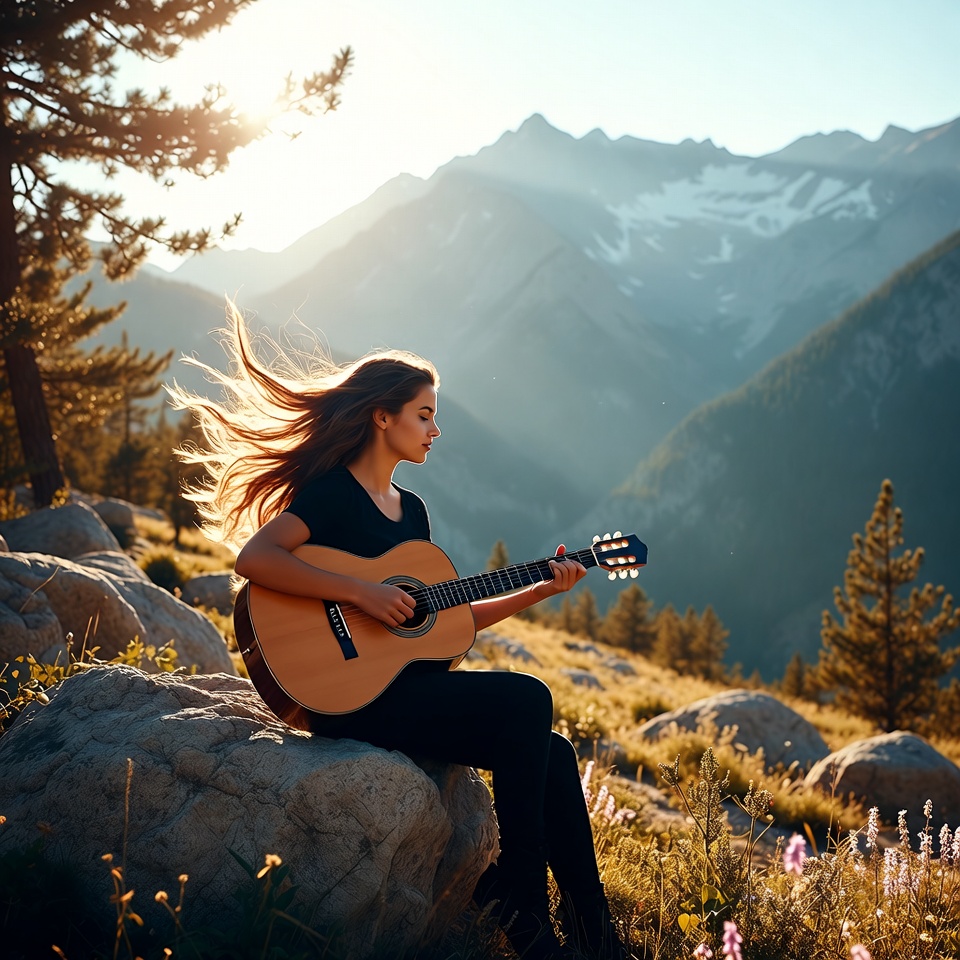 A woman plays guitar on a rock in a mountain area during sunset. Trees and peaks surround her as the sun sets beyond the mountains.