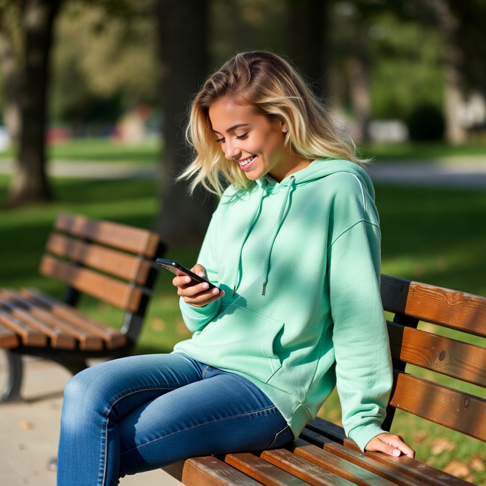 A young woman enjoys her time in a park while using her smartphone. It is sunny outside, and she sits comfortably on a wooden bench.