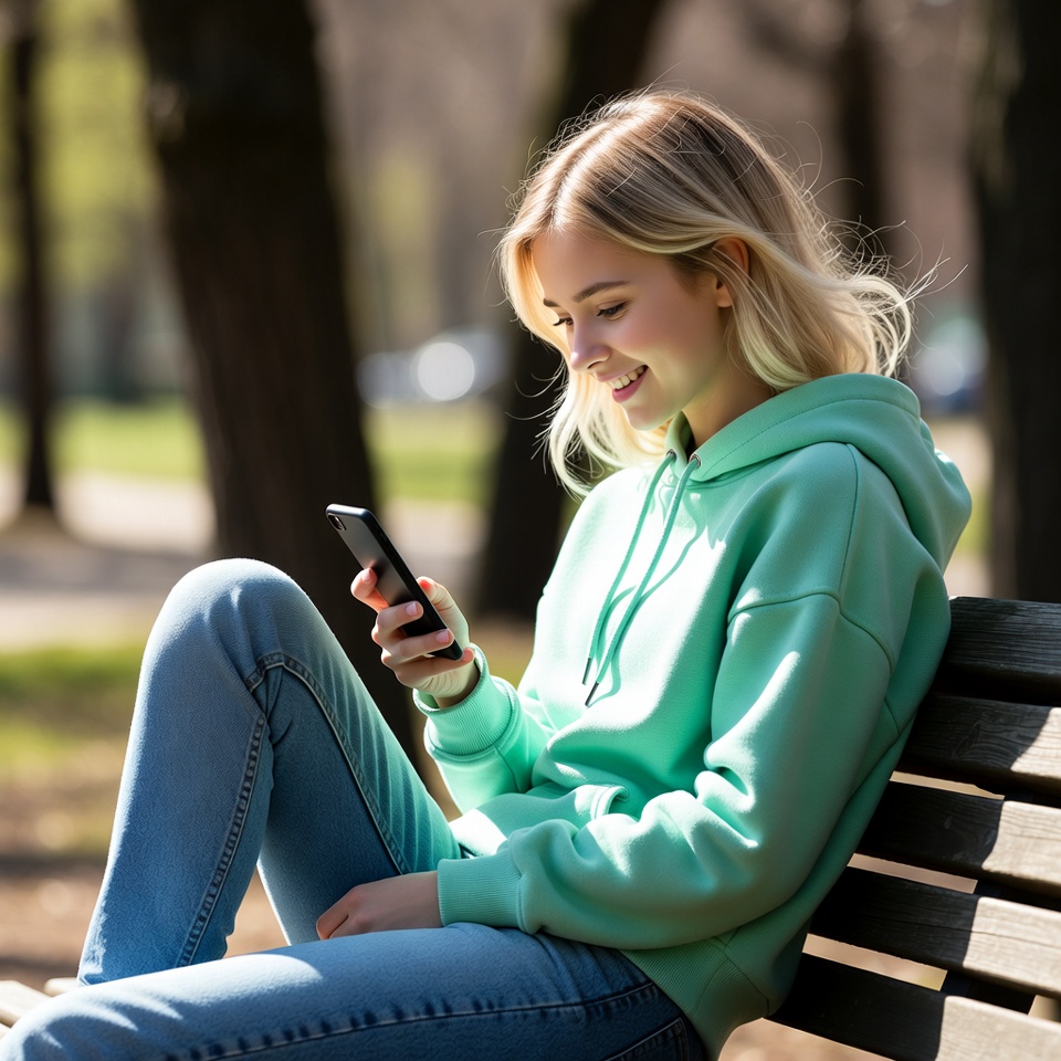 A young woman sits on a bench in a park, looking at her phone while smiling. Bright sun shines through the trees around her.