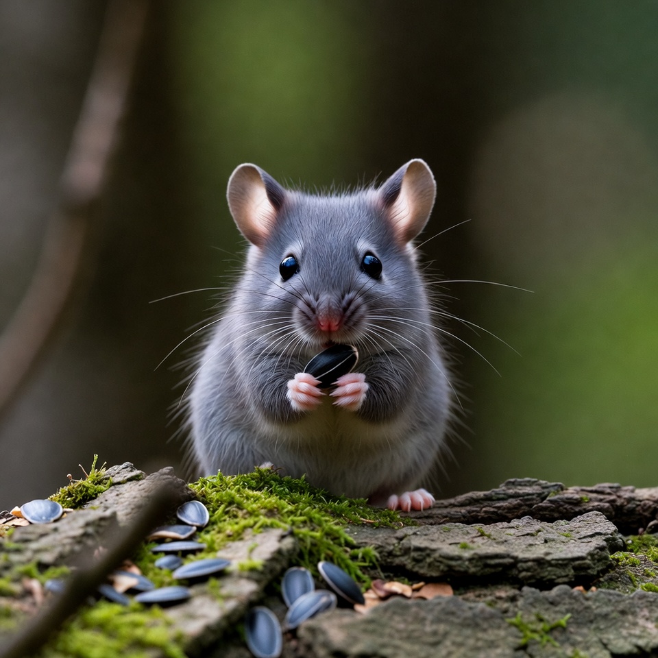 animal, cute, eating, food, foraging, forest, forest floor, gathering, gray fur, habitat, log, moss, mouse, nature, outdoors, paws, rodent, seed, small creature, wildlife