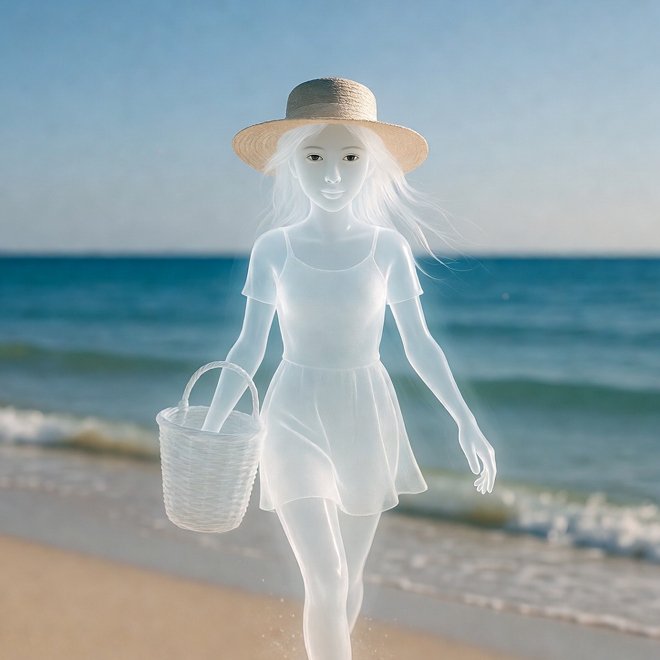 A girl walks along the beach carrying a basket. She enjoys the sun and sea breeze near the water's edge on a sunny day.